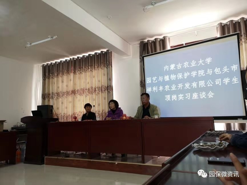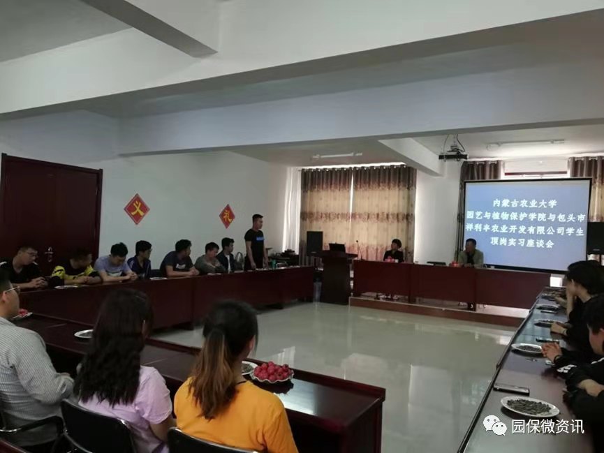 的王萍老师、实习学生与包头祥利丰农业发展有限公司杨总经理及员工代表一同召开了实习总结交流会。