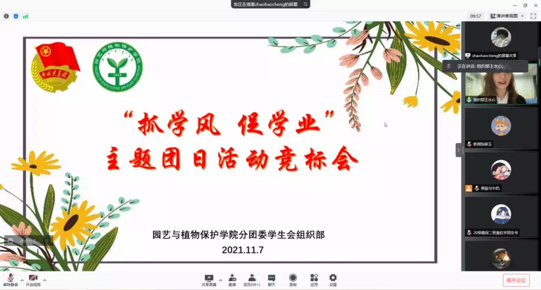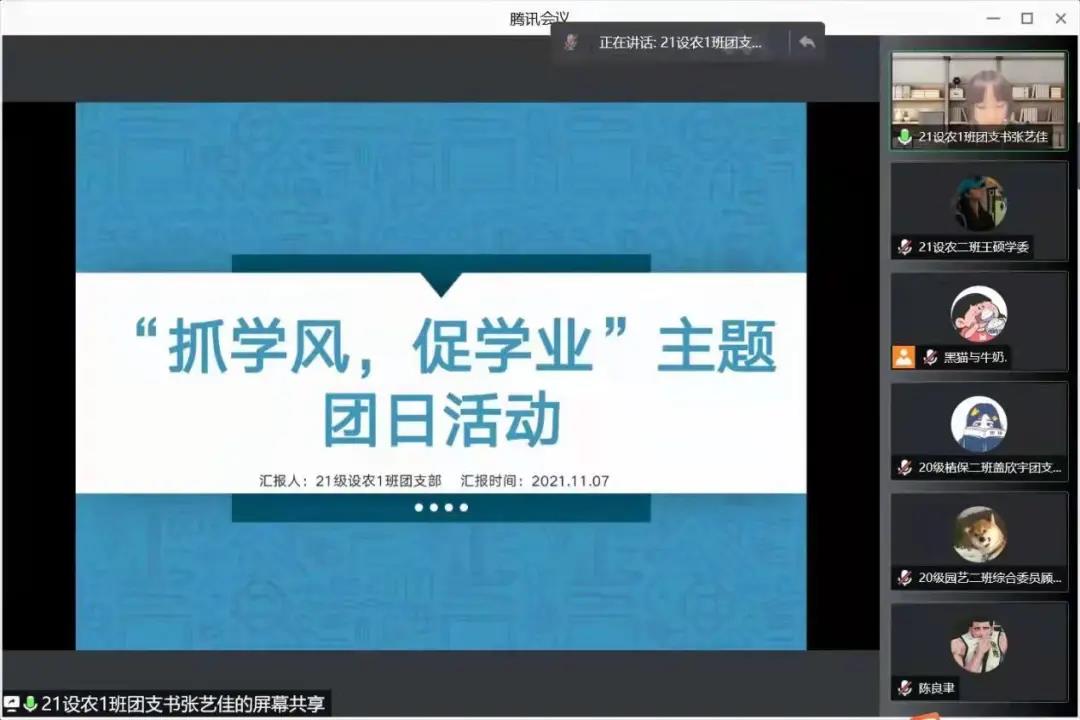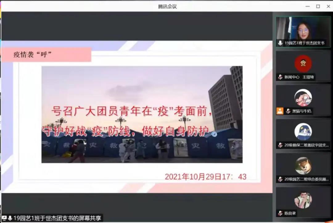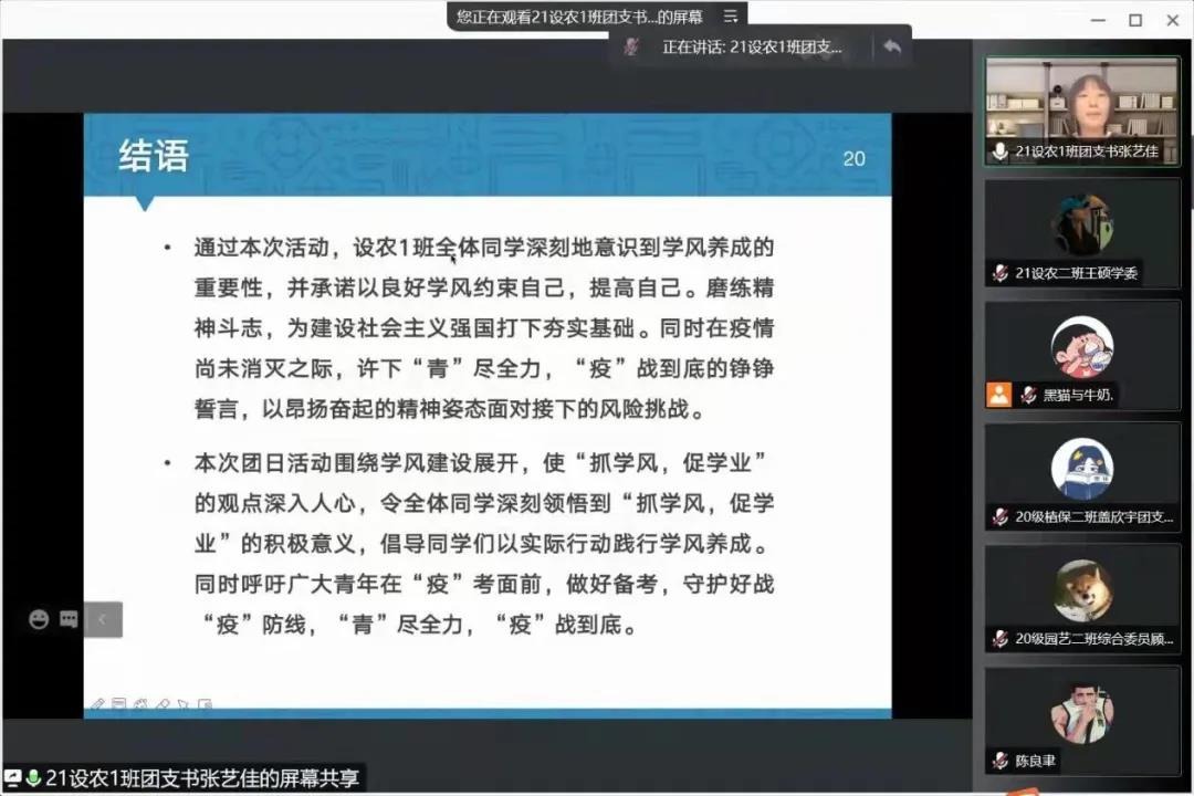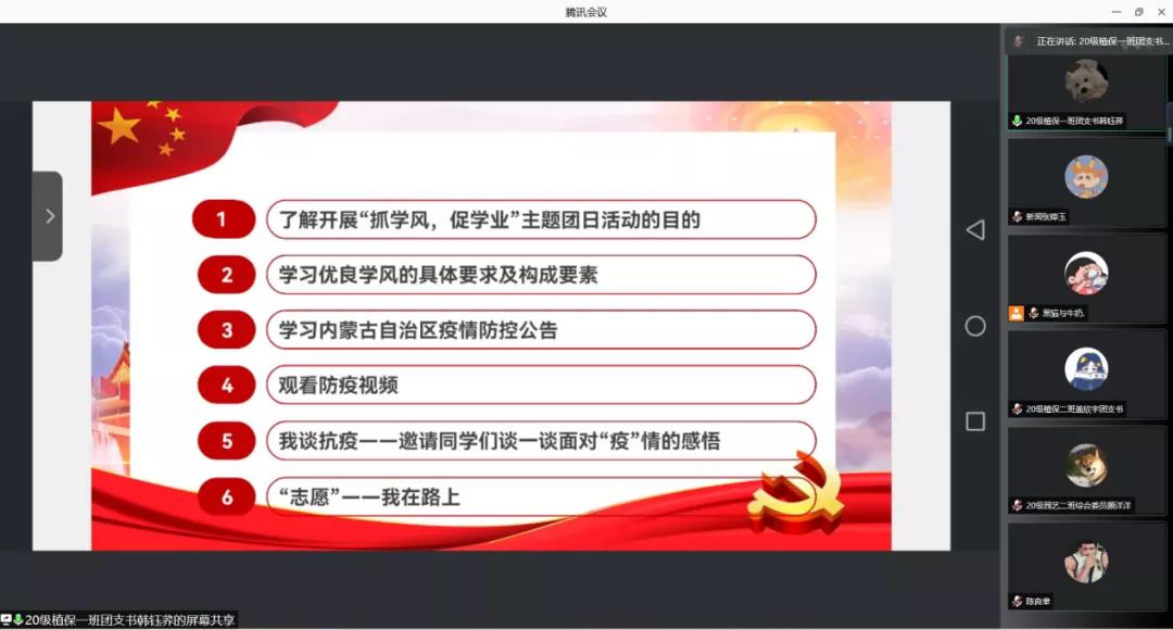 在腾讯会议线上开展了主题为“抓学风,促学业”的团日活动竞标会,组织部王水心担任主持人,院团委老师郝凤英及各班级团干部参加此次活动。