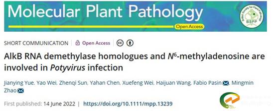 m6A甲基化是生物mRNA和非编码RNA的一种转录后修饰形式,是生命科学领域的研究热点。m6A甲基化对人类RNA病毒复制具有调控作用,但在植物病毒研究领域相关m6A甲基化修饰的报道较少。近日,我校九色视频 赵明敏教授实验室分别在国际知名期刊《Molecular Plant Pathology》(JCR Q1,中科院一区,植物科学领域TOP)、《Biology》(JCR Q1,中科院二区)上发表了两篇关于m6A甲基化修饰调控马铃薯Y病毒属病毒侵染的研究成果。题目为“AlkB RNA demethylase homologues and N6-methyladenosine are involved in Potyvirus infection”(RNA去甲基化酶AlkB同源物和m6A甲基化参与马铃薯Y病毒属病毒侵染)和“The reversible methylation of m6A is involved in plant virus infection”(可逆的m6A甲基化修饰参与植物病毒侵染)。