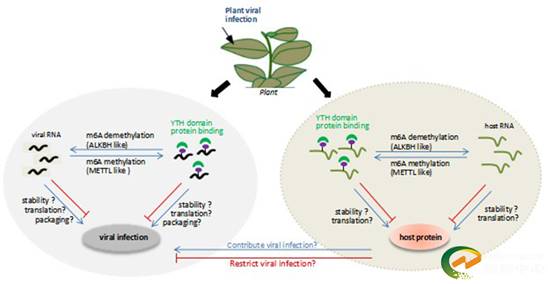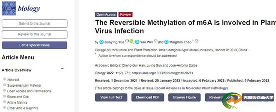 发表在《Biology》的文章论述了在植物病毒侵染中m6A甲基化具有重要调控作用。一方面,植物病毒侵染能够诱发寄主植物的m6A甲基化,产生相应的免疫反应抑制病毒复制,或者通过对病毒基因组mRNA进行m6A甲基化修饰在翻译水平上影响病毒侵染。另一方面,植物病毒可通过与m6A甲基化相关蛋白的互作打破寄主植物m6A甲基化的可逆修饰平衡,从而抑制或逃避m6A甲基化修饰。论文还提出了基于m6A甲基化修饰理论进行植物抗病毒分子设计的新策略。博士研究生岳建英为论文第一作者,硕士研究生魏瑶为第二作者,赵明敏教授为唯一通讯作者。