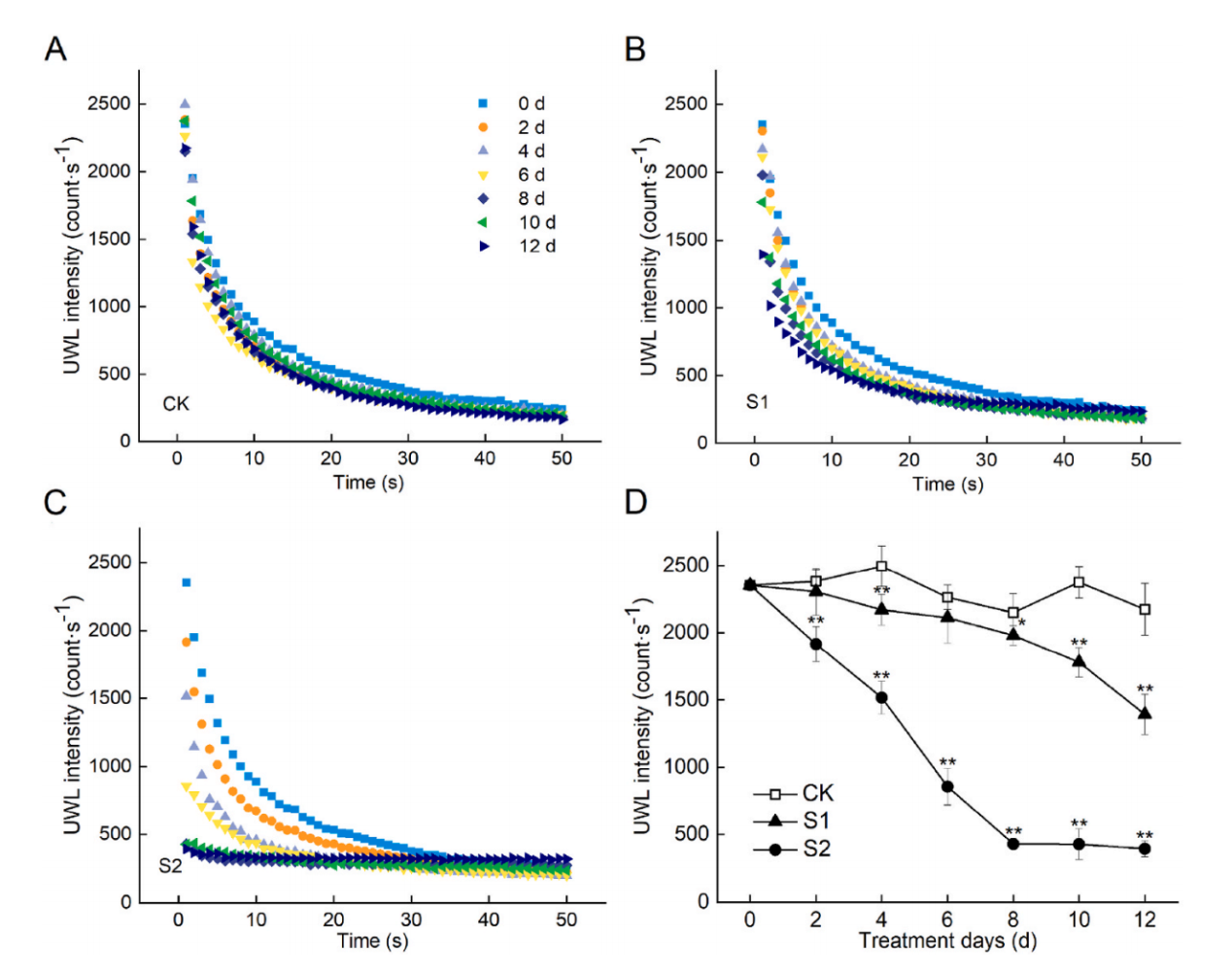 研究团队以盐胁迫为调控手段,测定了不同盐浓度下欧李叶片UWL强度和光系统活性(photosystem,PS)参数的变化趋势,并将UWL与PS参数进行相关性分析,发现盐胁迫严重抑制了PS活性、破坏了类囊体膜的完整性,降低了PSII的光化学效率,阻碍了QA-QB电子转移。同时,UWL的强度也降低。此外,PS活性各参数与UWL的相关性结果指出,UWL与光系统活性的主要参数显著相关。这一研究揭示了UWL的产生与PS活性有关,同时还明确了盐胁迫对欧李叶片PS活性的影响,这一成果可为UWL与植物的关系及机制领域的研究提供理论基础和新思路,也可为欧李耐盐性提供参考。