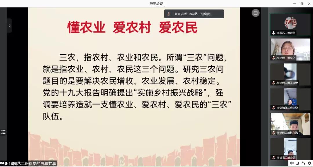 积极分子培训班的学员代表18级植保二班张晨杰以“学习宣传贯彻党的十九届五中全会精神”为主题,为大家详细讲解了习近平总书记“七一”重要讲话精神,提出作为积极分子应坚持不忘初心,继续前行的观点。19级园艺二班赵文静从“什么是党史、党情”开始,深入讲解中国共产党的百年奋斗史,告诫学员们中国人民的幸福,中华民族的伟大复兴,绝不是轻轻松松、敲锣打鼓就能实现的,必须是一步一个脚印,一届一个台阶,逐步实现的伟大历史革命。最后,党员代表何文炳总结本次活动,他讲到:通过“我来讲党课”这样的主题活动,可以激发同学们对于党史的深入学习,同时作为一名积极向党组织靠拢的同学,在工作中、生活中就要多一份责任,多一份辛劳,多一份担当。