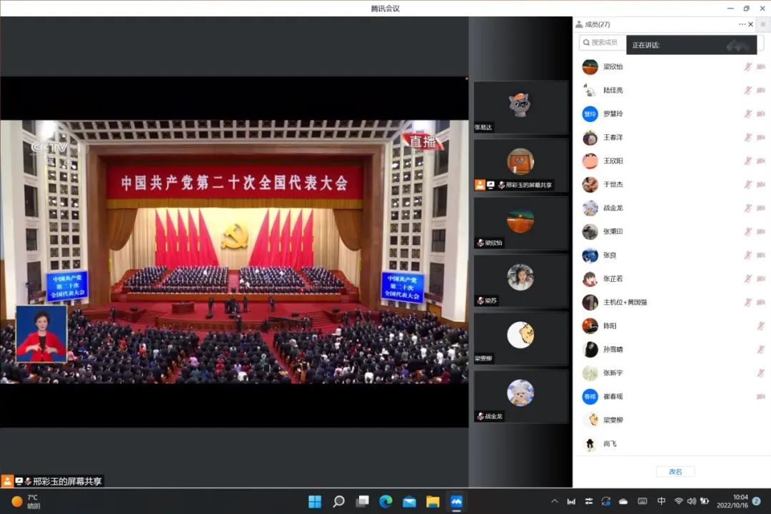 大会的主题是:高举中国特色社会主义伟大旗帜,全面贯彻新时代中国特色社会主义思想,弘扬伟大建党精神,自信自强、守正创新,踔厉奋发、勇毅前行,为全面建设社会主义现代化国家、全面推进中华民族伟大复兴而团结奋斗。大家认真聆听习近平总书记所作的报告,“全党同志务必不忘初心、牢记使命,务必谦虚谨慎、艰苦奋斗,务必敢于斗争、善于斗争,坚定历史自信,增强历史主动,谱写新时代中国特色社会主义更加绚丽的华章。”“新时代的伟大成就是党和人民一道拼出来、干出来、奋斗出来的!”党员同志们在听到总书记的精彩讲话后,纷纷在留言板上打出了习总书记的金句以及自己在观看过程中的所感所想。
