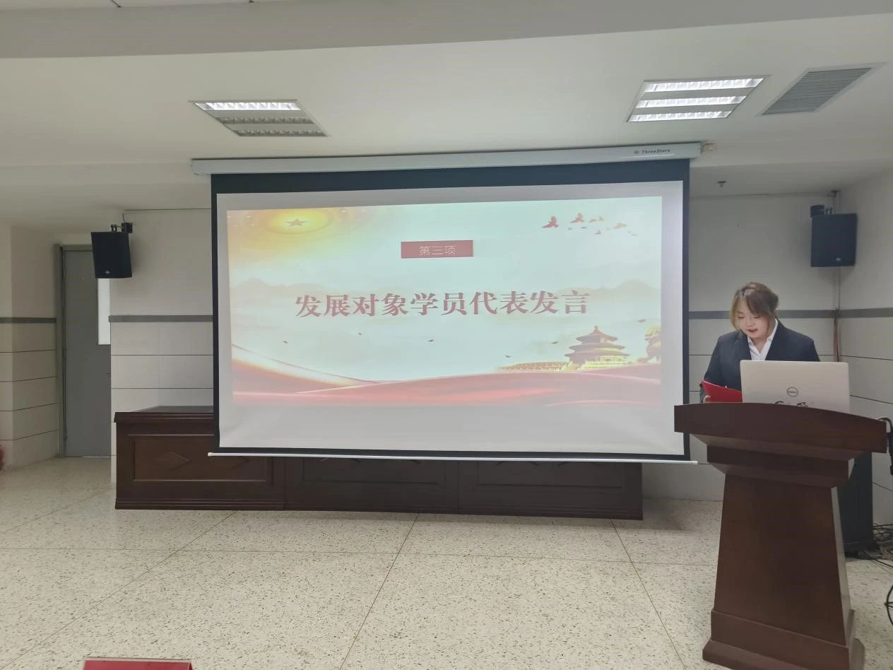 随后,发展对象代表闫馨月同学发言,她代表全体发展对象感谢党组织让大家更加全面、系统地学习党的理论知识,使得大家在思想上和认识上能对中国共产党有进一步的理解,也有机会对照党员标准反观自身存在的许多缺点和不足,从而得到进一步的提高,真正做到从思想上入党。最后代表同学们向党组织承诺,珍惜此次党校学习机会,努力提高学习效果,使自身在政治理论和思想道德水平上有明显的提升。她的发言深情并茂,赢得了阵阵掌声。