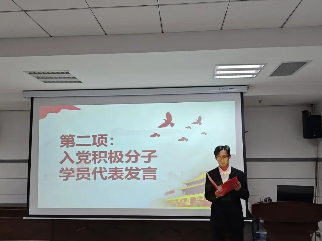 典礼在庄严的国歌声中拉开序幕。入党积极分子代表付传青同学在典礼上发言,他表示将珍惜此次培训机会,以端正的态度、饱满的热情投入学习党的理论,从百年党史中感悟“为中国人民谋幸福,为中华民族谋复兴”的初心和使命,让信仰在理论滋养中根深叶茂,争取早日成为一名政治坚定、素质过硬的共产党员。
