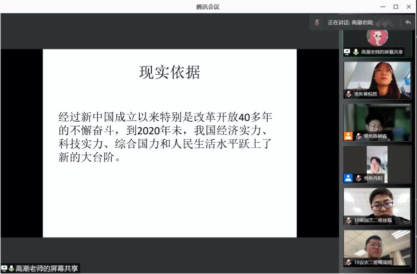 党课中,高潮老师为同学们介绍了“四史”包含了党史、新中国史、改革开放史、社会主义发展史。随后高潮老师重点强调,学习“四史”不仅是中国共产党的必修课,也是新时代中国大学生的必修课,希望同学们把两个必修课合二为一来学习“四史”。最后,高潮老师结合实际数据,为同学们分析了习近平总书记所说的“没有中国共产党,就没有新中国,就没有中华民族伟大复兴”这一真理。
