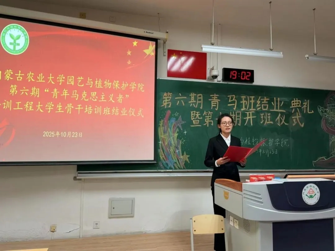第六期青马班学生代表翟桂莹发言。她讲到:在青马班学习过程中学到了理论转化为干事创业的本领,并许下不忘初心、服务人民的誓言,同时对领导老师致以诚挚的感谢,也祝愿新同学在未来的道路上永远坚定理想信念,在强国建设民族复兴的火热实践中绽放绚丽之花。