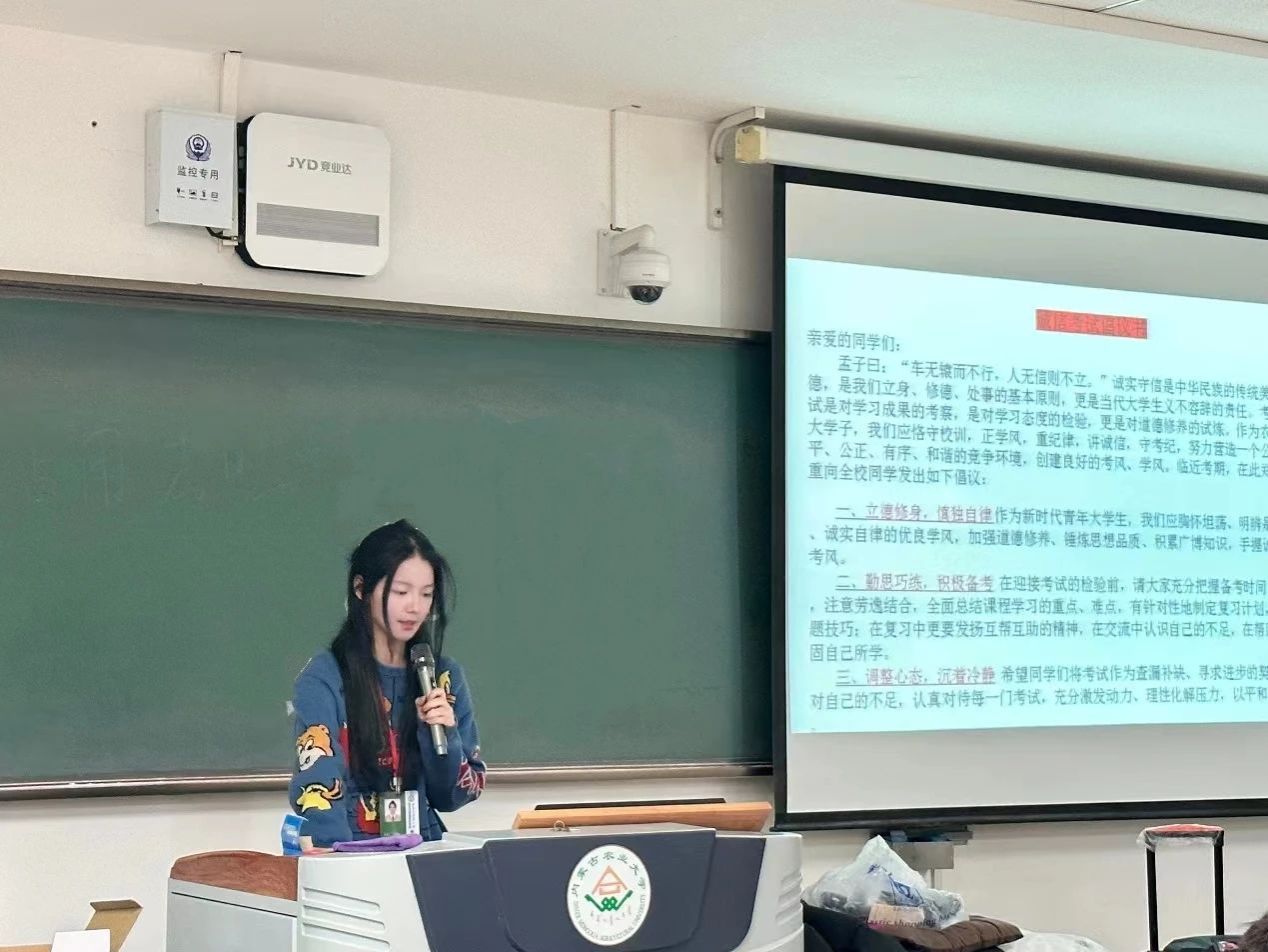 首先,学风建设中心但晓钰同学和薛雯静同学分别在南教326和223教室宣读了《诚信考试倡议书》和学生手册中有关考试作弊行为的处理规定,呼吁大家端正考试态度,维护校园风气。