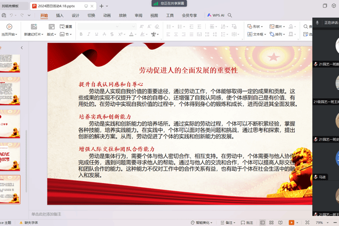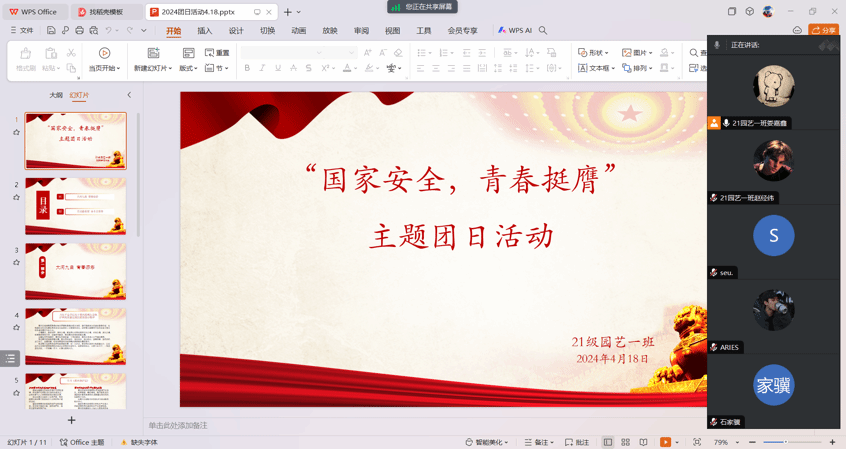 2024年4月18日晚,在外实习的21级园艺一班全体同学在团支书娄嘉鑫的组织下通过腾讯会议开展“国家安全,青春挺膺”主题团日活动。