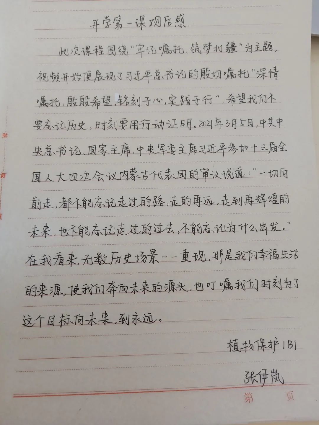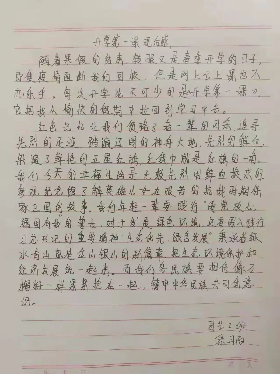对“开学第一课”进行了观看和学习后,同学们都表示心中激情澎湃,感慨万分,纷纷提笔写下了他们对于这节极具非凡意义课程的观后感。作为新时代的新青年,我们应当做到努力学习,增长才干,砥砺品格,知史爱党,知史爱国,把期望转化为肩上的责任、心中的信念和前进的动力,奋力跑出不负青春、不负时代的更快速度,努力成为中国特色社会主义事业的合格建设者和可靠接班人。