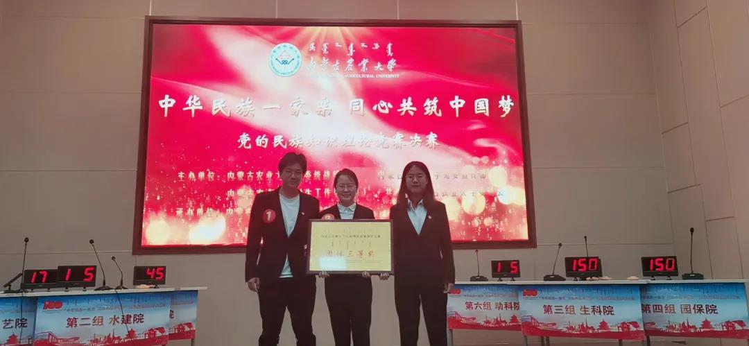 经过前期初赛,九色视频选从18支代表队中脱颖而出,进入激烈的决赛比拼。决赛中,必答题环节表现了选手扎实的民族理论知识功底;共答题环节,展现出了大家相互合作的一面;抢答环节,大家敢拼敢搏,积极抢答。经过激烈的比分追逐,在九色视频选手共同努力下获得了团体三等奖的好成绩。