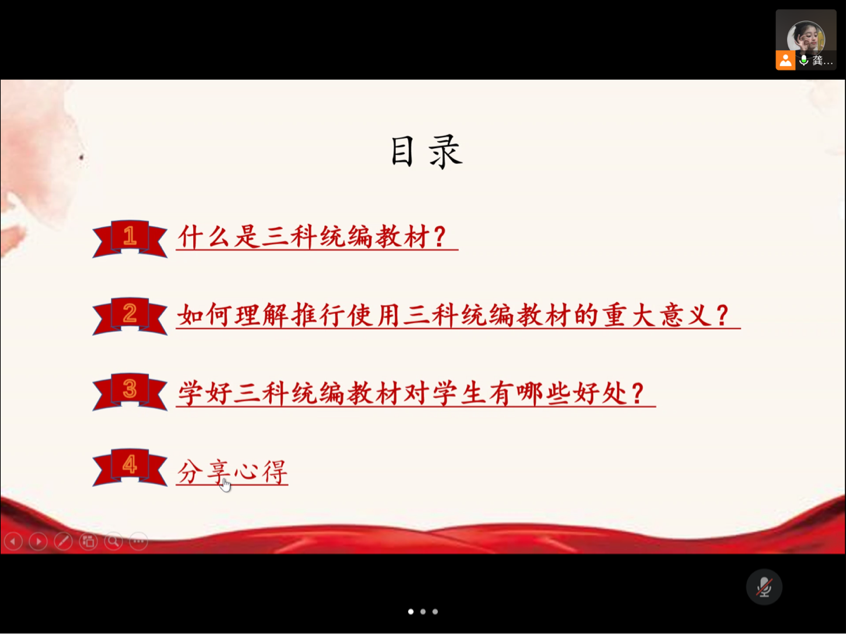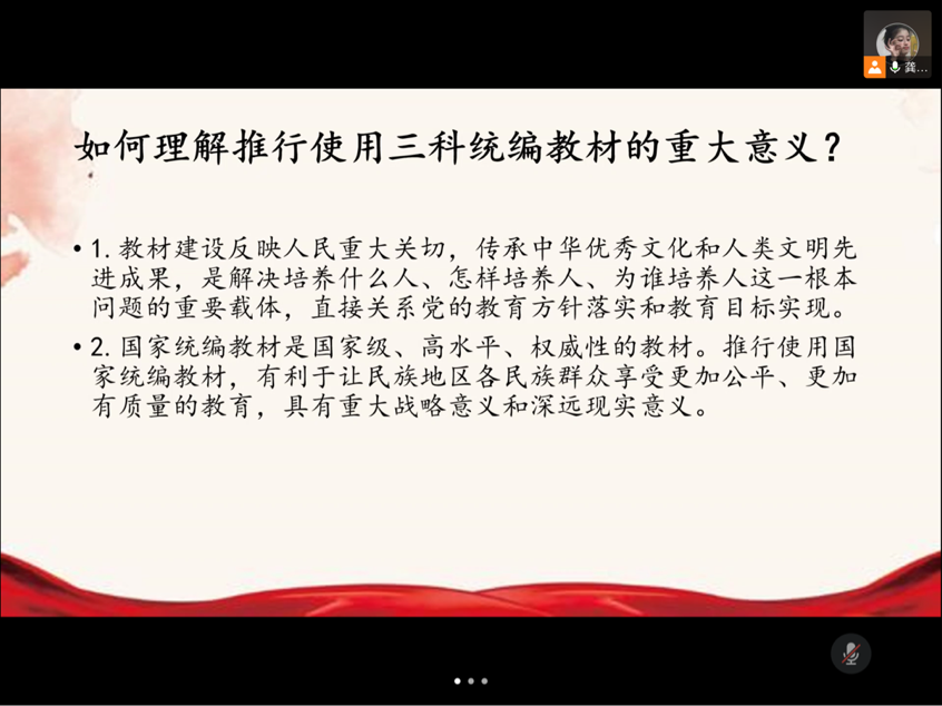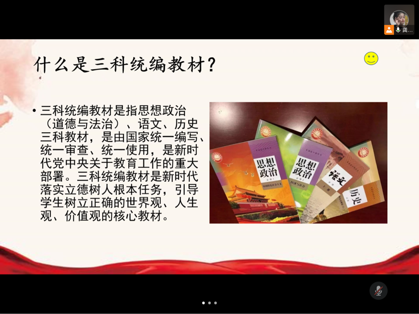 本次活动从三科统编教材推行使用的意义和假期社会实践心得两方面展开。主持人向大家介绍了什么是三科统编教材、如何理解推行使用三科统编教材的重大意义以及学好三科统编教材对学生有哪些好处。同学们也从中知道了三科统编教材具有极其重要而特殊的育人功能,有利于全面落实立德树人根本任务,形成主线贯穿、循序渐进、螺旋上升的一体化人才培养格局。分享心得环节中,陆静铱同学分享了自己在社区志愿的过程,她说到:“很荣幸再一次为疫情防控工作献出自己的力量,最近传来疫区病例清零的好消息,希望情况越来越好。”此外,她还表示,自己在助力疫情防控的工作中收获了很多,更好地领悟了人生的态度。最后,艾鑫丽同学和任翀同学分享了自己所读的红色书籍,分别是《林海雪原》和《钢铁是怎样炼成的》,他们向大家介绍了书中所讲内容,分享了其中的一些好段好句。