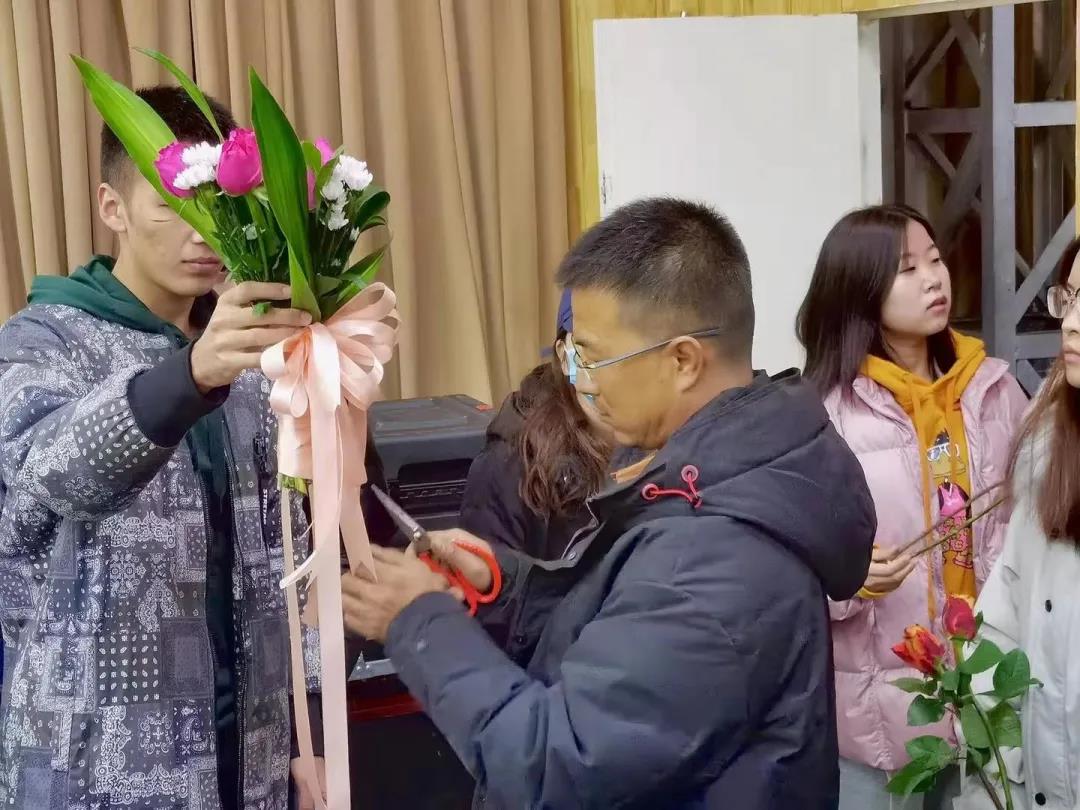 段飞师兄首先带领同学们认识了各种花材,为学生们拓展了花卉知识,并指导学生进行手捧花制作。在制作过程中,同学们将所有带分叉的花材花头10厘米以下的的分叉、叶子剪掉,用螺旋的手法依次添加花材,一支主花加一支配花或叶子,然后用丝带把花杆缠绕一圈,用力拉紧,使整个面服帖光滑,最后缠绕完成后收尾打结,以漂亮的法式蝴蝶结点缀,一束美丽的捧花就制作完成了。在大家动手制作的过程中,同学们还认识到手捧花一定要选择适合的花材并将其颜色进行合理的搭配。看着自己精心创作的作品,同学们更是爱不释手,纷纷拿起手机拍照。