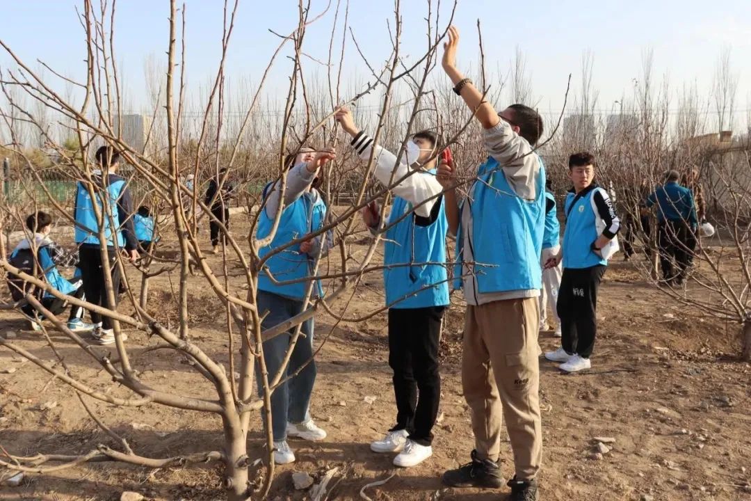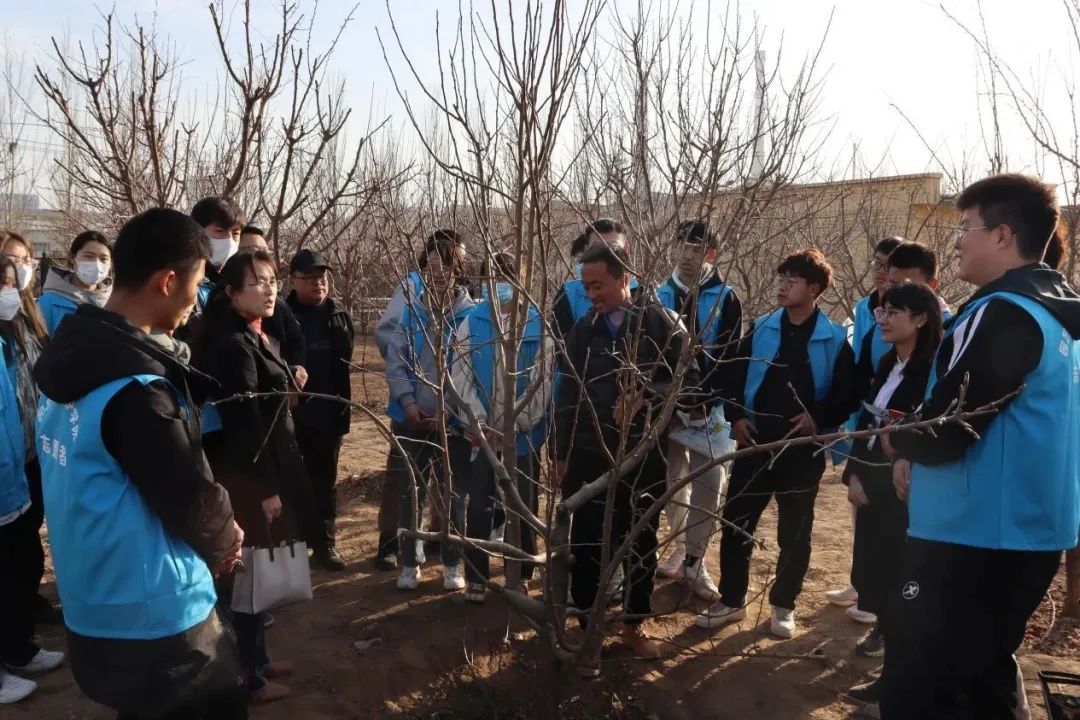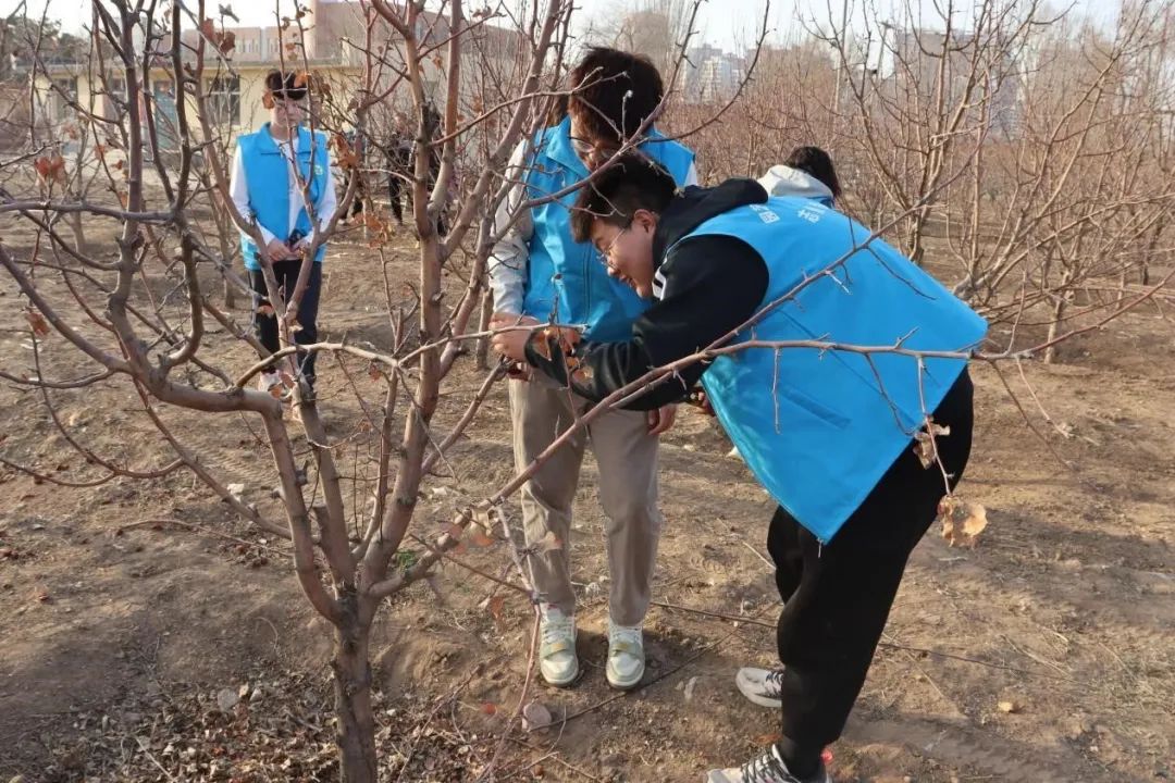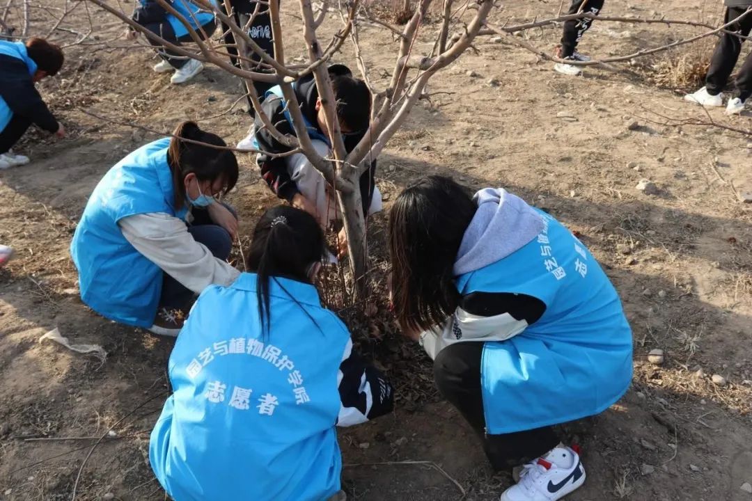 党委副书记李艳、果树教研室主任李正男、团委老师郝凤英的带领下,25名学生在科技园区(东园区)开展义务修剪果树志愿服务活动。