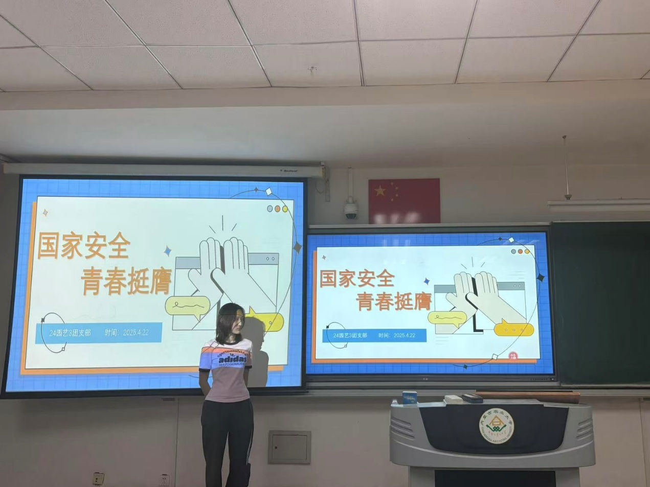 号召,深入学习贯彻总体国家安全观,增强青年学生的国家安全意识和责任感,激发青年学生维护国家安全贡献力量的热情,24级园艺3班于4月22日组织开展“国家安全,青春挺膺”主题团日活动。本次团日活动由团支书李沛臻主持,全体同学积极参与,班主任史丽老师进行活动指导。