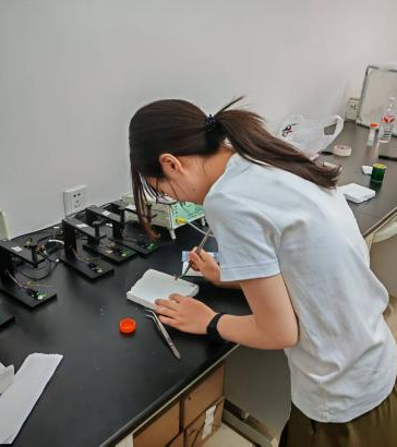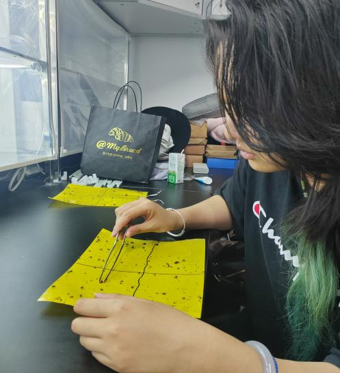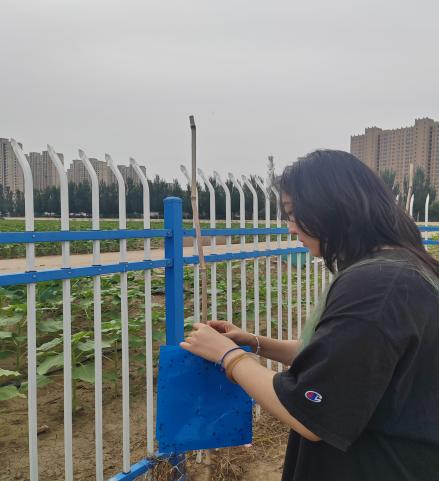 植物保护研究所实习的同学们,主要任务是更换田间设置的黄蓝板,并对板上诱捕的害虫进行分类、计数与保存。