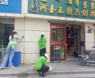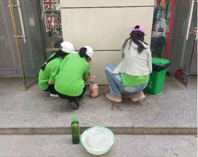 第二组队员则专注清除对联留下的底胶。春节期间,家家户户门上贴的对联虽然增添了节日气氛,但随着时间的推移,对联被撕下后留下的底胶却成了难以清理的难题。队员们利用铲子、清洁剂等专业工具,耐心地清除着每一块底胶,还原街道墙面原本的整洁面貌。