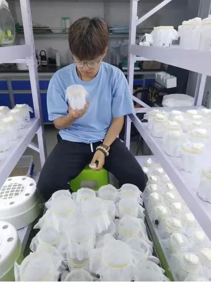当实践队的成员到达后,这里的研究生向大家介绍了实习工作的基本流程。首先告诉同学们需要将诱虫灯内的虫子收集起来,回到改良中心将虫子放到密封袋内,之后放到冰箱内冷冻,这样就方便之后分类。这个诱虫灯内有很多种虫子,有鳃金龟,天蛾,还有各式各样的甲虫和蛾子,第一次看到这么多实物,而且还有很多没有在书本见过的,这让实践队的成员都大吃一惊。在进行蠋蝽的检卵、收卵等一系列工作中,给配对的蠋蝽内看有没有卵,有的在纸上,有的在杯壁上,有的甚至在纱网上,稍不留神就会错过,在这期间也需要观察供它们取食的蚕蛹是不是新鲜,还有就是蠋蝽的存活,如果有坏的蚕蛹或者死掉的蠋蝽需要重新放入虫子和蚕蛹。