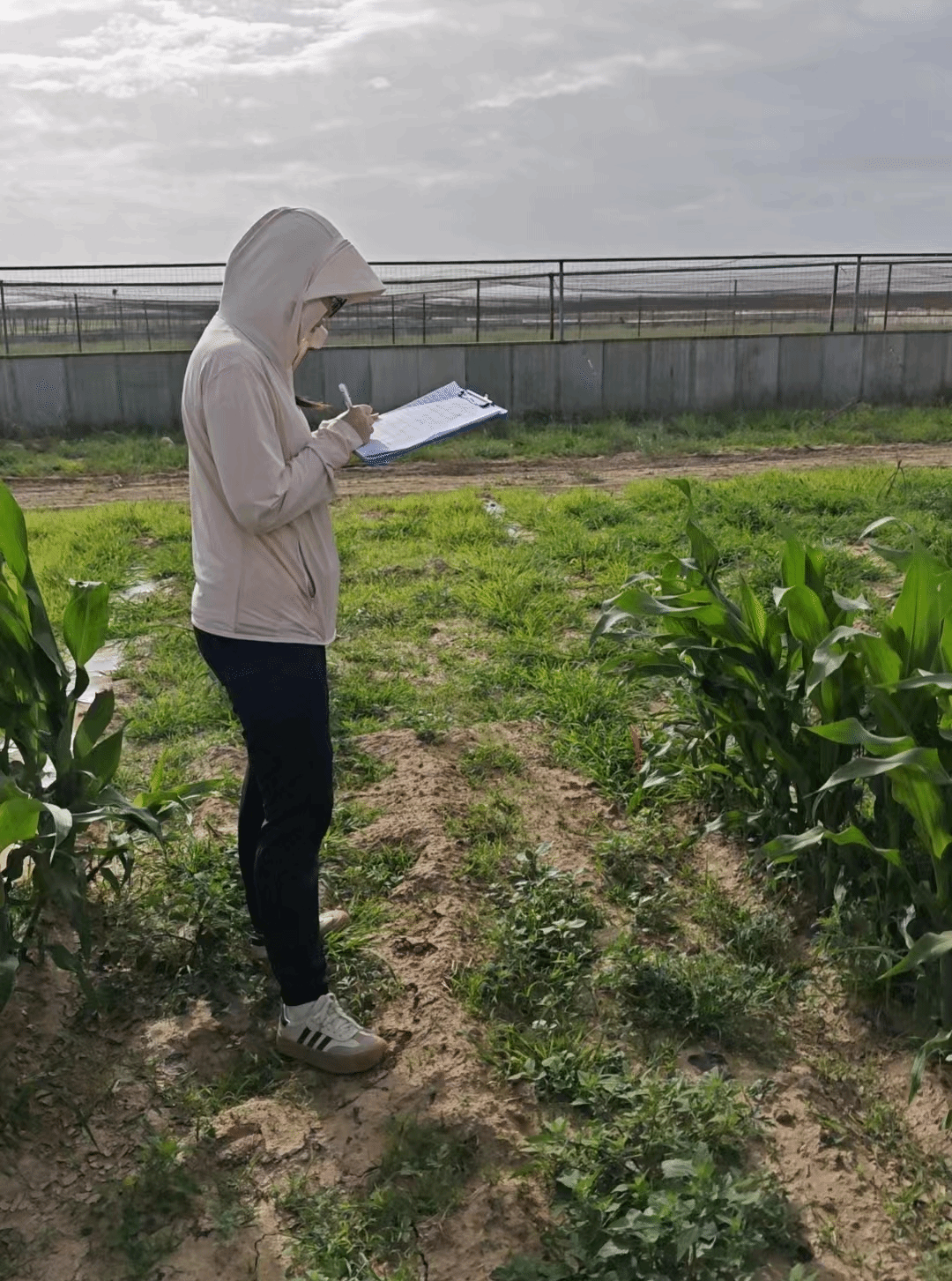 同学们还有一项工作内容就是进行测量玉米的株高,并且记录好数据,按照五点取样法去取样。有矮的也有高的,高的甚至能达到200厘米,人进去后看不到在哪里。