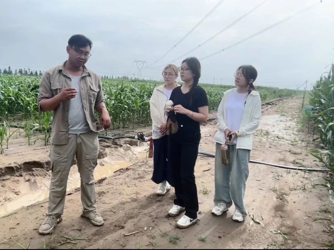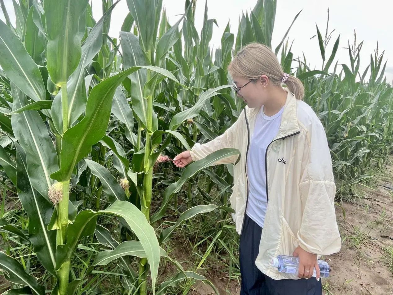 实践队队员在杨永培老师的带领下走进中早熟组二年区域试验田中,向队员们介绍玉米田中的病虫害类型,带领队员们观察玉米遭受病虫害后表现的病征。随后,杨永培老师带着队员们走到不同的试验田中,向队员们讲解不同玉米品种的差异,大家在不同的玉米试验地里认真观察,不断地运用书本知识和老师所讲授的知识认真观察辨识玉米在盐碱地和正常土地的不同长势。