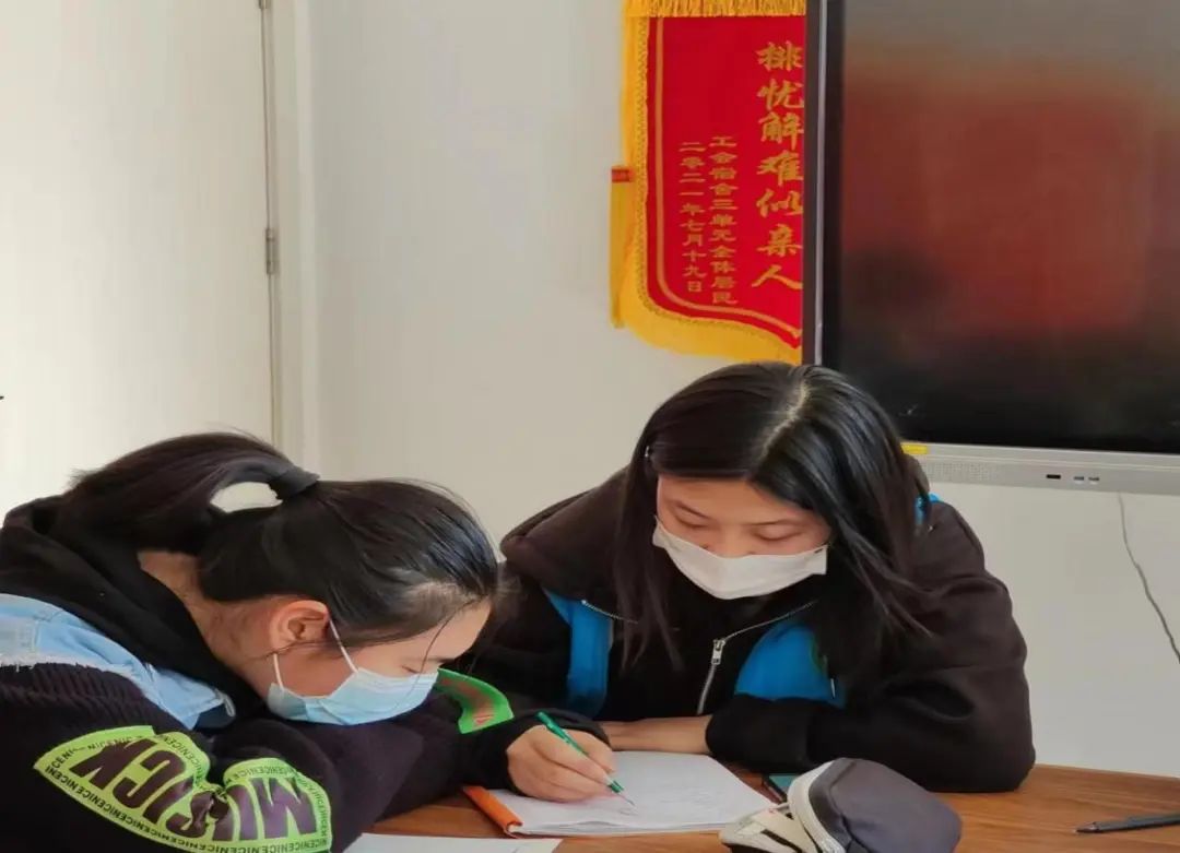 志愿者们还耐心细致地为社区孩子们开展助学支教,解答他们的问题,跟他们讲解题目的解法。孩子们也很配合,积极回答问题,认真听讲,有问题也会及时询问。