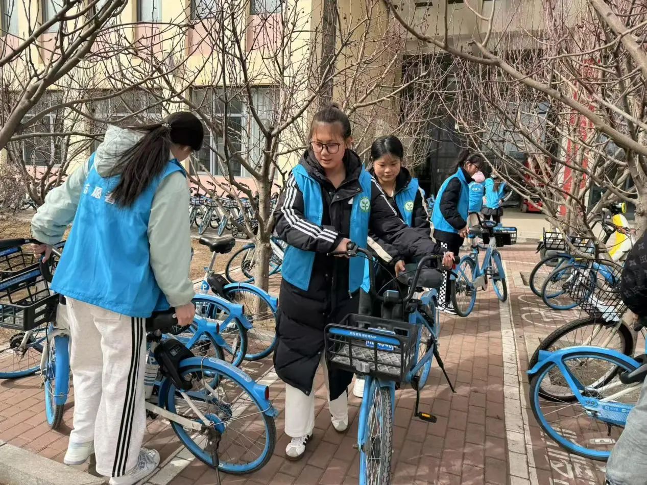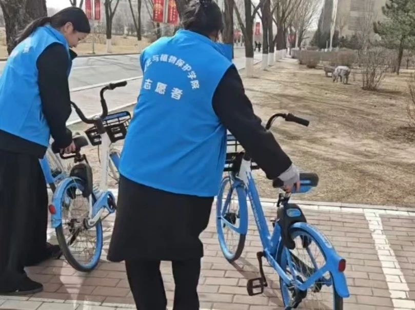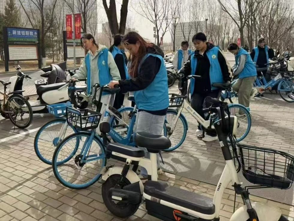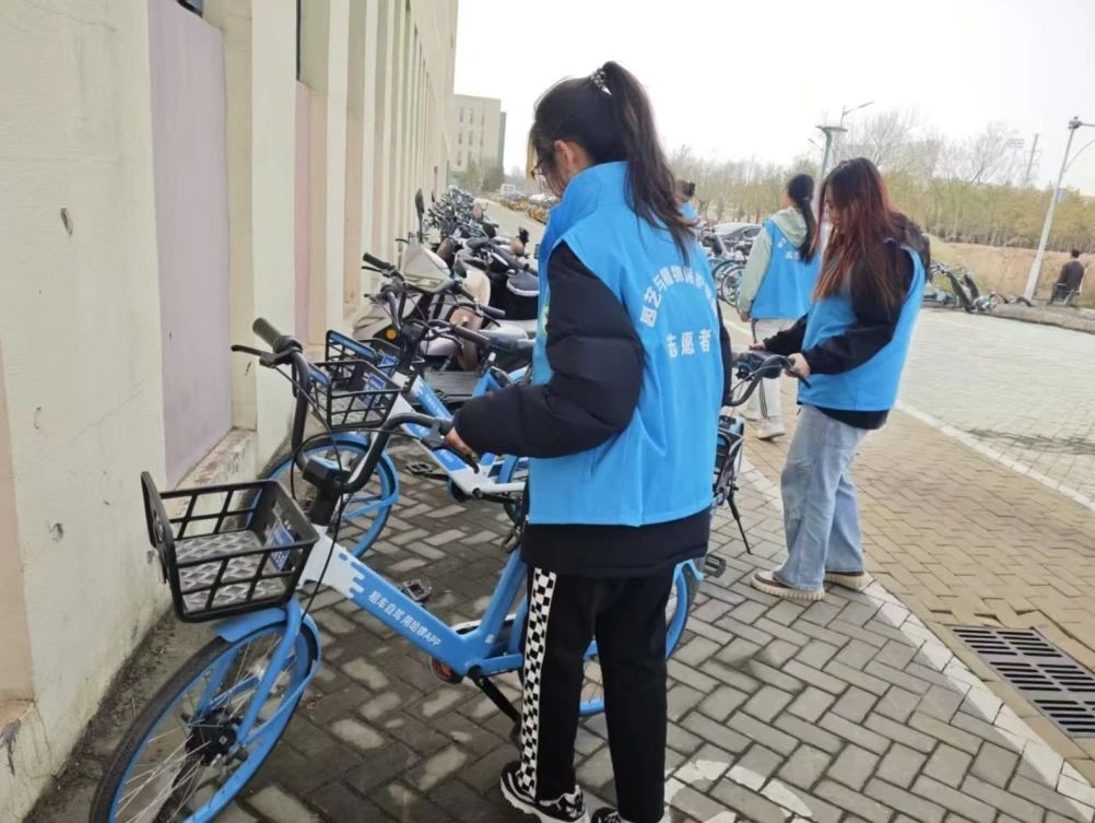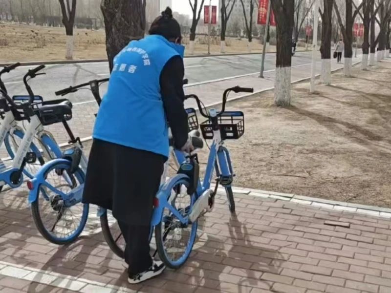 活动伊始,志愿者们早早集合,他们身穿统一服装,迅速投入到工作中。面对校园中杂乱无章的共享单车,志愿者们分工明确,有的负责将车辆从角落、人行道上搬运至指定停放区域,有的则按照品牌、车型进行分类排列。尽管天气有些寒冷,但志愿者们的热情丝毫不减,他们不辞辛劳,穿梭在校园中。