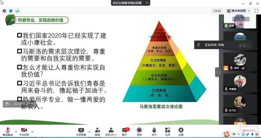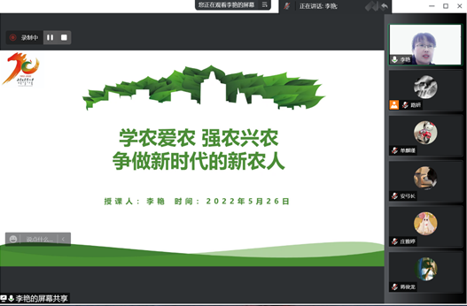 领导李艳副书记为2020级植物保护专业和2020级农学卓越班的学生在线讲授了题为“学农爱农,强农兴农,争做新时代的新农人”的课程思政课。李书记从认识农业、读懂农业,改革开放40年以来我国农业科技的主要成就与难题,延伸到未来我国农业科技的主要任务进行讲授,最后希望同学们能够知农爱农、在希望的田野上建功立业。旁征博引,层次递进。以袁隆平院士心系“禾下乘凉梦”和“杂交水稻覆盖全球梦”的实例讲述先生几十年如一日播撒智慧之种,把自己对祖国的赤胆忠心和对人民的满腔热忱凝结在串串饱满的稻穗上,书写在祖国的神州大地上,镌刻在闪亮的共和国勋章上。给学生们以启示:袁隆平院士的胸怀、境界和共产主义理想,是我们学习的榜样和楷模。同时,李书记还结合学生身边的榜样,即农学专业的高聚林校长在玉米科学领域做出的突出贡献,以及植物保护专业周洪友院长和赵君教授在植物病理学领域所做出的成绩,鼓励同学们“学农爱农,强农兴农,争做新时代的新农人”。
