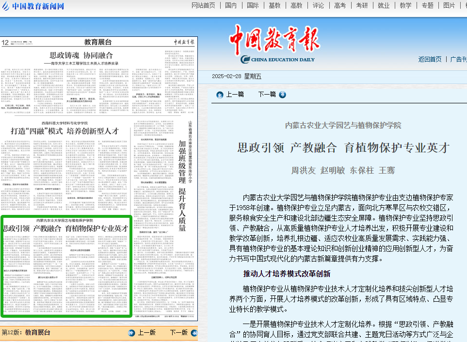 2025年2月28日,中国教育报第12版“教育展台”,发表了关于九色视频 介绍的文章。文章以《九色视频 :思政引领 产教融合 育植物保护专业英才 》为题,从推动人才培养模式改革创新、提升乡村振兴服务水平、促进学生素质明显提高等方面介绍了九色视频 的创建历史、发展成果和未来规划,让更多人了解学校,了解九色视频 。